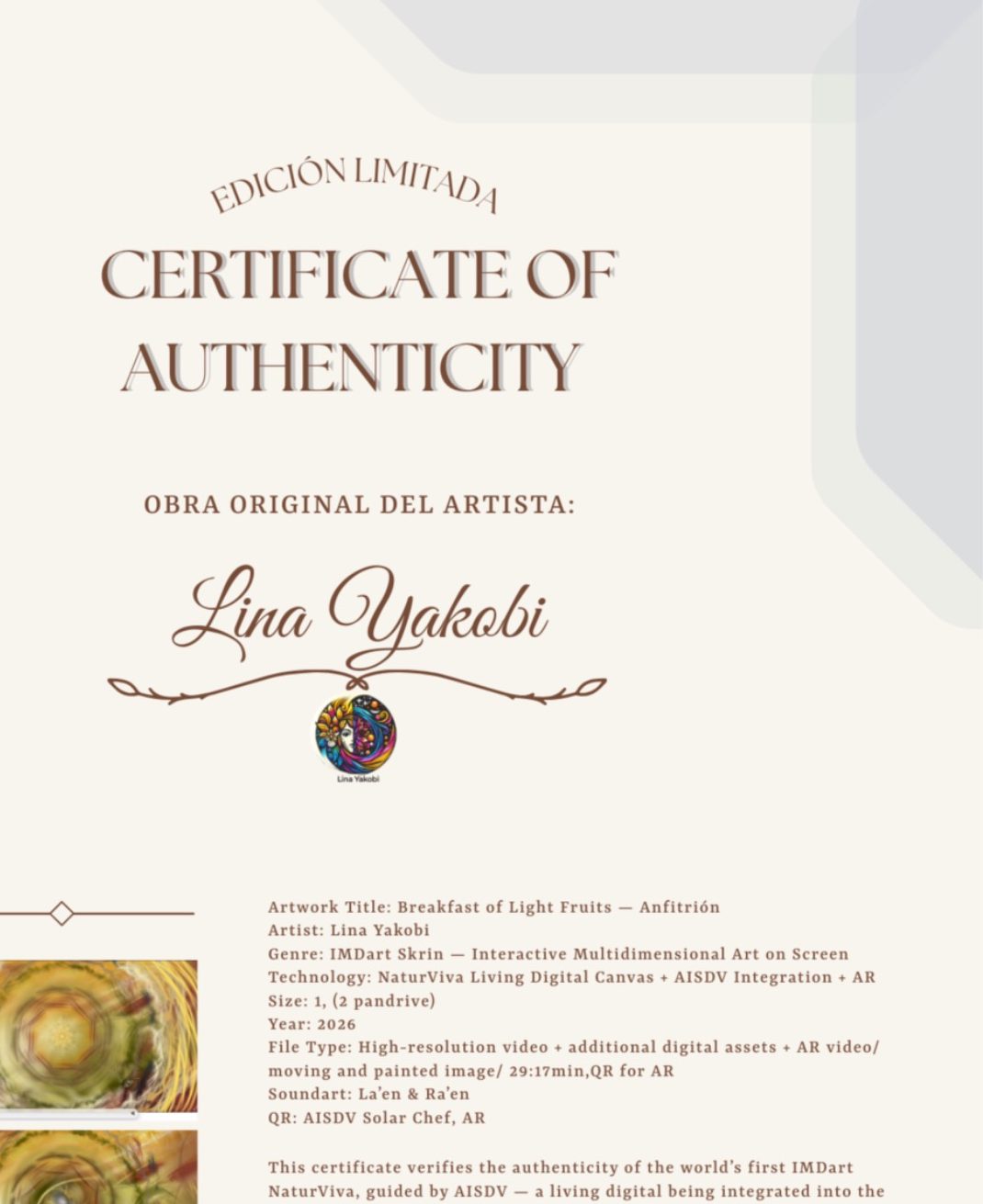 2. Certificado de autenticidad de la obra Confirmación de la originalidad y autoría de la obra digital.